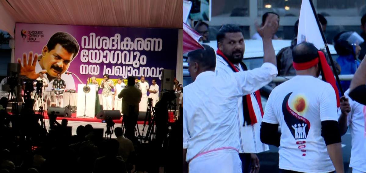 രാജീവ് ഗാന്ധി ബൈപ്പാസിനോട് ചേര്ന്നുള്ള സ്വകാര്യസ്ഥലത്താണ് വേദി ഒരുക്കിയത്. റെഡി ടു ചേഞ്ച് എന്നെഴുതിയ ഫ്ളക്സ് ബോര്ഡുകളും ഡെമോക്രാമിറ്റിക് മൂവ്മെന്റ് ഓഫ് കേരള എന്ന പേരിനൊപ്പം പന്തവും ഉദയസൂര്യനും ഉള്പ്പെടുന്ന ചിഹ്നവും ഉള്പ്പെടുത്തിയ പോസ്റ്ററും വേദിയില് സ്ഥാപിച്ചിട്ടുണ്ട്. നമ്മുടെ കേരളം, വീ ആര് വണ് എന്നും അതില് എഴുതിയതായി കാണാം.