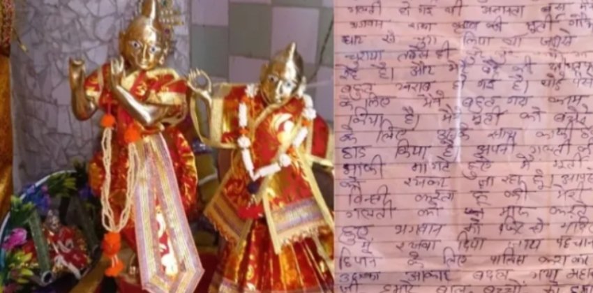 ക്ഷേത്രത്തിൽ നിന്നും മോഷ്ടിച്ച കൃഷ്ണന്റെയും രാധയുടെയും വിഗ്രഹങ്ങൾ തിരികെ നൽകി കള്ളൻ. ഇതിനോടൊപ്പം ക്ഷേത്ര പൂജാരിയോട് ക്ഷമ ചോദിച്ച് മോഷ്ടാവ് കത്തും വിഗ്രഹത്തിൽ വച്ചിട്ടുണ്ടായിരുന്നു.വിഗ്രഹങ്ങളോടൊപ്പമുള്ള കത്തിൽ മോഷണം നടത്തിയതിന് പിന്നാലെ കുടുംബത്തിലെ എല്ലാവരും ദുഃസ്വപ്നങ്ങൾ കാണുകയാണെന്നും ഭാര്യയയും കുട്ടികളും ഉൾപ്പെടെ രോഗബാധിതരായെന്നുമാണ് പറയുന്നത്.