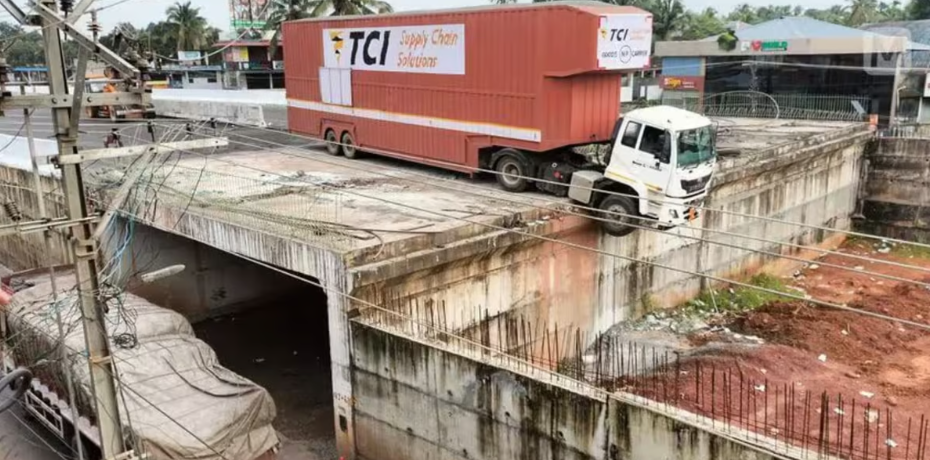 റോഡ് മാറി ഓടി കണ്ടെയ്നര് ലോറി..താഴേക്ക് വീഴുന്നതിന് മുൻപ്..ഒഴിവായത് വൻ ദുരന്തം…