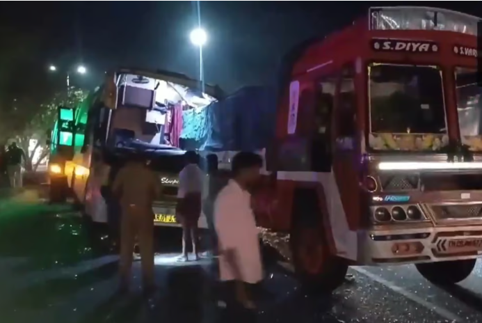 സ്വകാര്യ ബസുകളും ലോറിയും കൂട്ടിയിടിച്ച് ഒരു സ്ത്രീ ഉൾപ്പെടെ നാലു പേർ മരിച്ചു.15 പേരിലധികം ആളുകൾക്ക് പരിക്കറ്റിട്ടുണ്ട്.ഇന്ന് പുലർച്ചെ ചെന്നൈ-തിരുച്ചിറപ്പള്ളി ദേശീയ പാതയിൽ മധുരാംഗത്താണ് അപകടം.