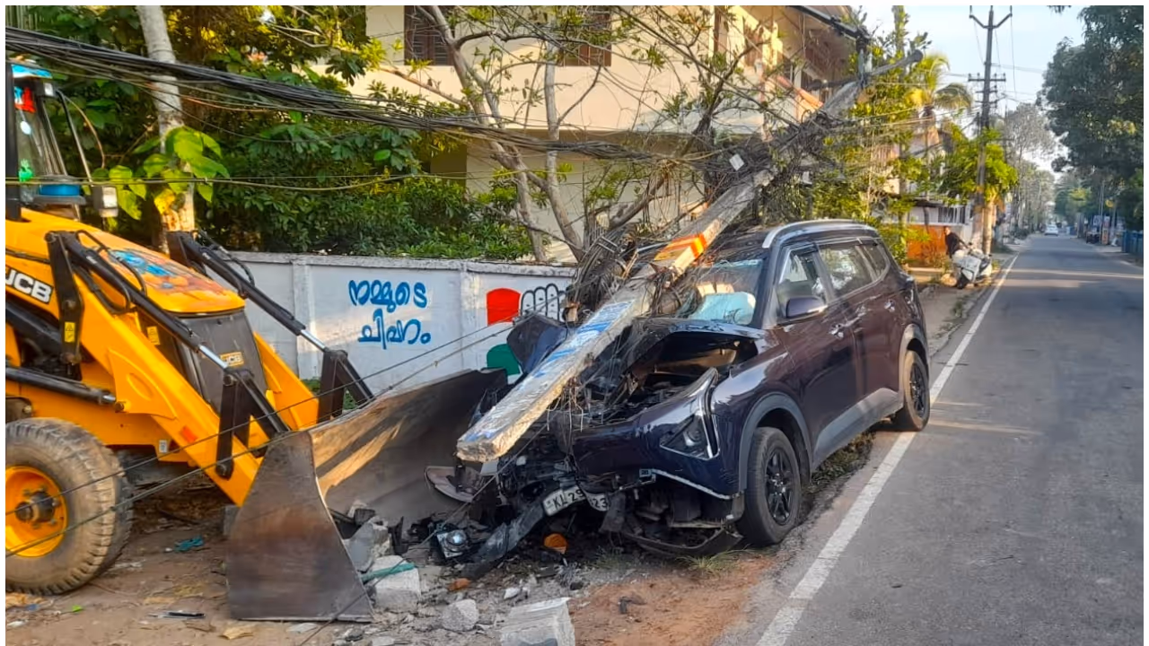 നിയന്ത്രണം വിട്ട കാർ ഇടിച്ച് വൈദ്യുതി പോസ്റ്റ് തകർന്നു, പൊട്ടിവീണത് കാറിന് മുകളിൽ…. സംഭവം ഹരിപ്പാട്