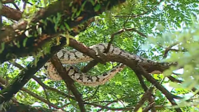എറണാകുളത്തപ്പൻ ഗ്രൗണ്ടിന് സമീപത്തുള്ള മരത്തിന് മുകളിൽ കൂറ്റൻ പെരുമ്പാമ്പ്. റോഡിലൂടെ നടന്നു പോയവരാണ് മരത്തിന് മുകളിൽ പാമ്പിനെ കണ്ടത്. വനംവകുപ്പ് ഉദ്യോഗസ്ഥരെത്തി പാമ്പിനെ പിടികൂടും.