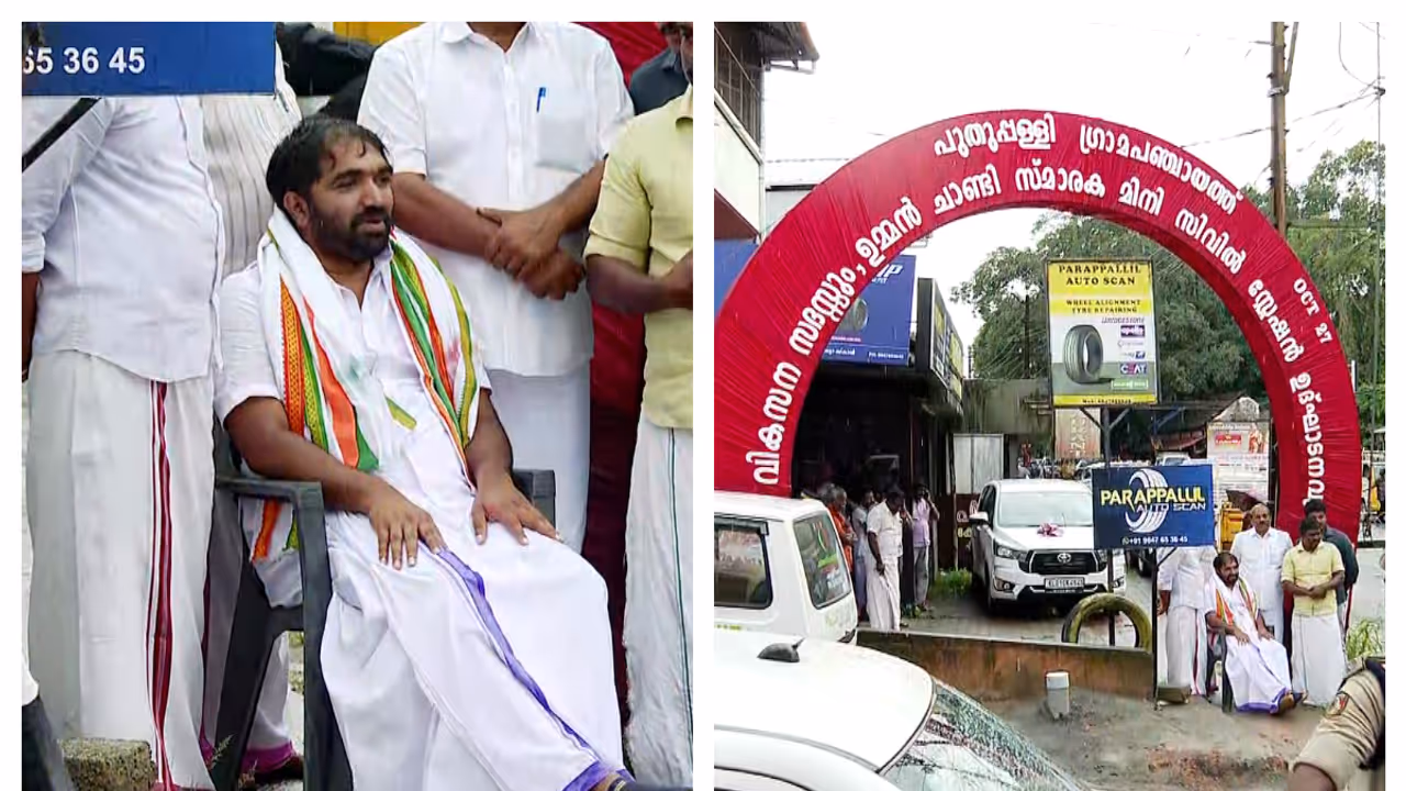 പുതുപ്പള്ളി പഞ്ചായത്തിൻറെ വികസന സദസ്സ് വേദിക്ക് മുന്നിൽ കുത്തിയിരുന്ന് ചാണ്ടി ഉമ്മൻ