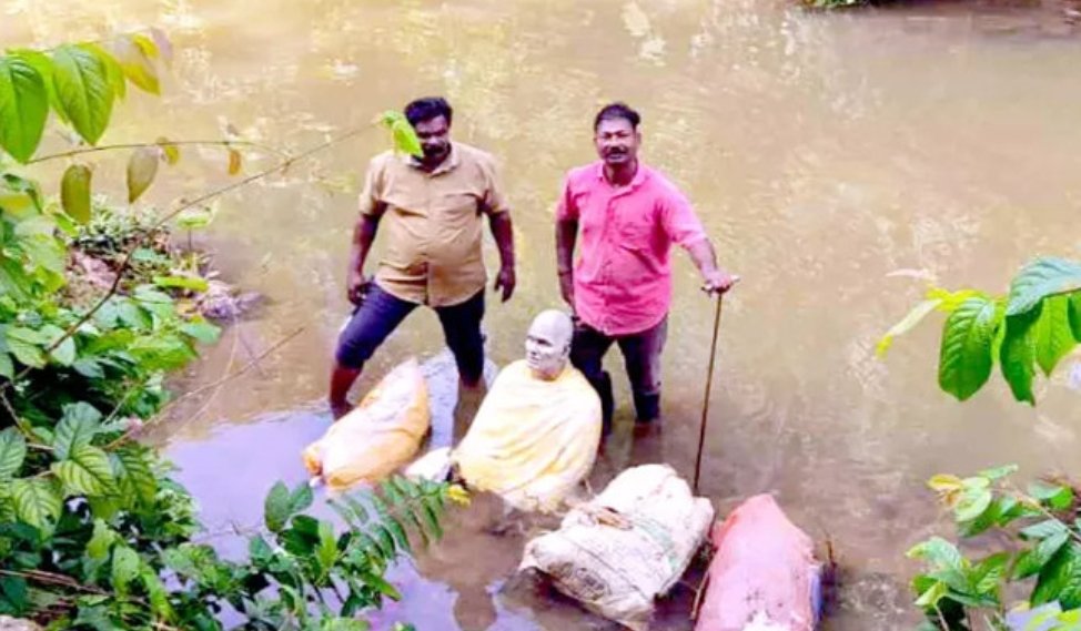 മലിന ജലം ഒഴുകുന്ന കൈതോട്ടിൽ ശ്രീനാരായണ ഗുരുദേവന്റെ പ്രതിമ… പൊലീസിൽ പരാതി….