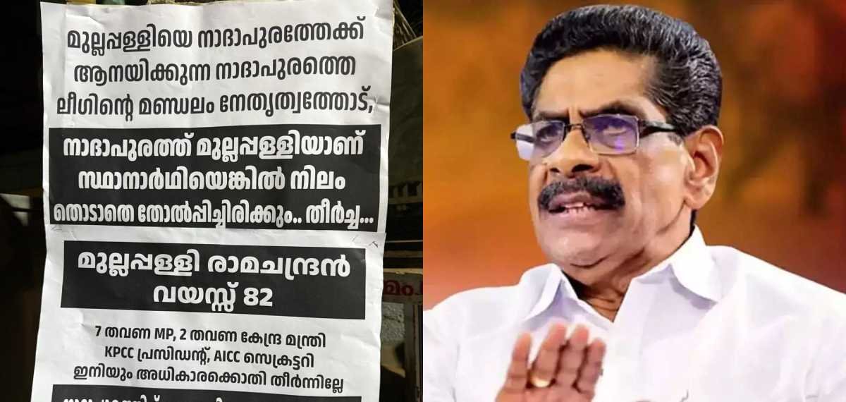 ‘മുല്ലപ്പള്ളിയെ നാദാപുരത്തേക്ക് ആനയിക്കുന്ന ലീഗിന്റെ മണ്ഡലം നേതൃത്വത്തോടാണ്, നാദാപുരത്ത് മുല്ലപ്പള്ളിയാണ് സ്ഥാനാര്‍ത്ഥിയെങ്കില്‍ നിലം തൊടാതെ തോല്‍പ്പിച്ചിരിക്കും..തീര്‍ച്ച’, എന്നാണ് പോസ്റ്റര്‍. 7  തവണ എംപിയും, 2  തവണ കേന്ദ്രമന്ത്രിയും കെപിസിസി പ്രസിഡന്റും എഐസിസി സെക്രട്ടറിയുമായ മുല്ലപ്പള്ളിക്ക് ഇനിയും അധികാരക്കൊതി തീര്‍ന്നില്ലേയെന്നും പോസ്റ്ററിലുണ്ട്. മുല്ലപ്പള്ളി രാമചന്ദ്രന്‍ ഇത്തവണ നാദാപുരത്തുനിന്നോ കൊയിലാണ്ടിയില്‍ നിന്നോ,  നിയമസഭയിലേക്ക് മത്സരിച്ചേക്കുമെന്ന അഭ്യൂഹങ്ങള്‍ക്കിടെയാണ് പോസ്റ്റര്‍ പ്രത്യക്ഷപ്പെട്ടിരിക്കുന്നത്. കഴിഞ്ഞ ദിവസവും മുല്ലപ്പള്ളി രാമചന്ദ്രനെതിരെ പോസ്റ്റര്‍ പ്രത്യക്ഷപ്പെട്ടിരുന്നു. കഴിഞ്ഞ നിയമസഭാ തിരഞ്ഞെടുപ്പില്‍ കോണ്‍ഗ്രസ് പാര്‍ട്ടി അധികാരത്തില്‍ നിന്ന് പുറത്തുപോകാന്‍ കാരണക്കാരനായ മുല്ലപ്പള്ളി ഇനിയും വിശ്രമ ജീവിതം തുടരട്ടെയെന്നായിരുന്നു പോസ്റ്റര്‍.