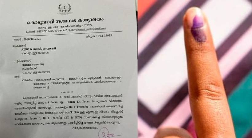 വാർഡ് വിഭജനം പൂർത്തീകരിച്ച് കരട് വോട്ടർ പട്ടിക പുറത്ത് വന്നപ്പോൾ വോട്ടുകൾ നഷ്ടമായെന്നായിരുന്നു പ്രദേശവാസികളുടെ പരാതി. പരാതിയെ തുടർന്ന് യുഡിഎഫിന്റെ നേതൃത്വത്തിൽ നാട്ടുകാർ കളക്ടറേറ്റിന് മുന്നിൽ പ്രതിഷേധവുമായി എത്തി. തദ്ദേശ വകുപ്പ് ഡയറക്ടർ നഗരസഭയിൽ നേരിട്ടെത്തി പരിശോധനകൾ നടത്തിയിരുന്നു. പിന്നാലെയാണ് അസി.സെക്രട്ടറിയുടെ കത്ത്. ഒരു വാർഡിലെയും വിവരങ്ങൾ അടങ്ങിയ നോട്ടിസോ രേഖകളോ ഓഫിസിലില്ലെന്നതാണ് കത്തിൽ പറയുന്നത്. ബൾക്ക് ട്രാൻസ്ഫർ സംബന്ധിച്ച് നിയമാനുസൃതമായി പാലിക്കേണ്ട നടപടി ക്രമങ്ങളും പാലിച്ചിട്ടില്ലെന്നും കത്തിൽ വ്യക്തമാക്കുന്നു.