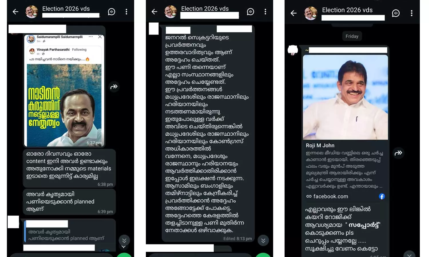 തിരഞ്ഞെടുപ്പ് ഫലം വരും മുൻപേ മുഖ്യമന്ത്രി സ്ഥാനത്തേക്ക് അവകാശവാദമുന്നയിച്ച് വിവിധ ഗ്രൂപ്പുകൾ രംഗത്തെത്തിയിരുന്നു. വി.ഡി. സതീശൻ, കെ.സി. വേണുഗോപാൽ, രമേശ് ചെന്നിത്തല എന്നിവരെ പിന്തുണയ്ക്കുന്ന സൈബർ ഗ്രൂപ്പുകൾ സജീവമാണ്. ഇതിനിടെ, ‘ഇലക്ഷൻ 2026 വിഡിഎസ്’ എന്ന വാട്സാപ്പ് ഗ്രൂപ്പിൽ നടന്ന ചർച്ചകളുടെ സ്ക്രീൻ ഷോട്ടുകൾ പുറത്തുവന്നത് പാർട്ടിക്കുള്ളിലെ വിഭാഗീയത മറനീക്കി പുറത്തുകൊണ്ടുവന്നു.