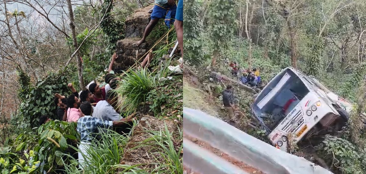 ന്നു. കുട്ടിക്കാനം മുതല് മുണ്ടക്കെ വരെ കൊടും വളവുകളും കുത്തനെയുള്ള ഇറക്കങ്ങളുമാണ്. ഈ പാതയില് വെച്ചാണ് അപകടം. യാത്രക്കാരില് പലരും ഉറക്കത്തിലായിരുന്നു. 34 പേരാണ് ബസിൽ ഉണ്ടായിരുന്നത്.ഒരാളുടെ നില ഗുരുതരമായി തുടരുകയാണ്. ഇയാളെ പാല മാർസ്ലീവ ആശുപത്രിയിലേക്ക് മാറ്റി. മരിച്ച ബിന്ദുവിന്റെ ഭർത്താവ് ഉണ്ണിത്താനും പാലായിലെ സ്വകാര്യ ആശുപത്രിയിൽ ചികിത്സയിൽ കഴിയുകയാണ്.