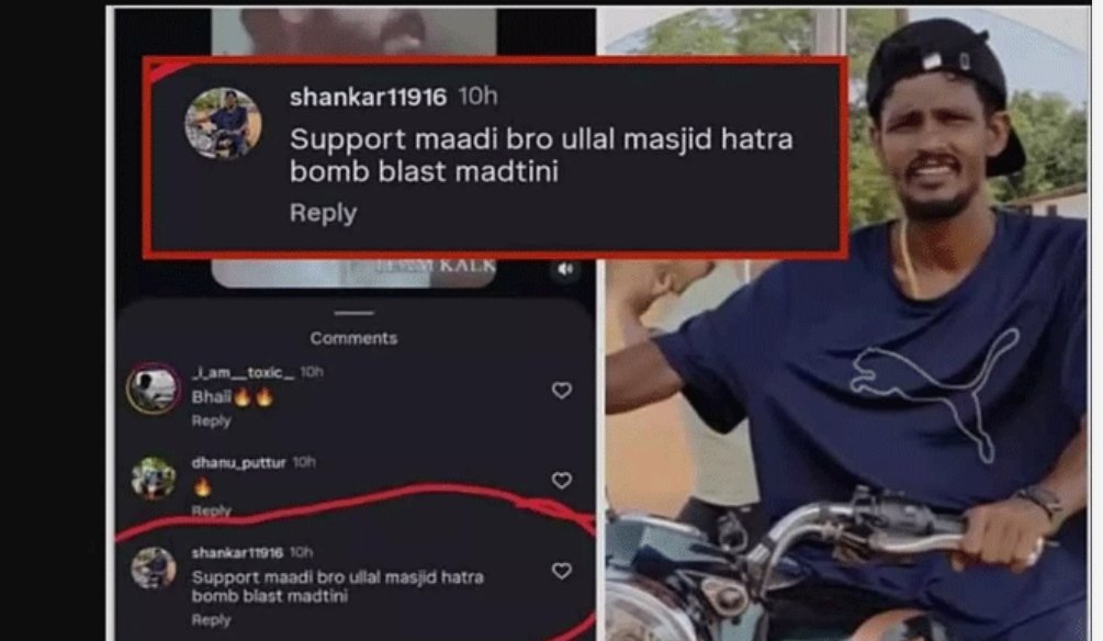 “സപ്പോർട്ട് മാഡി ബ്രോ ഉള്ളാൽ മസ്ജിദ് ഹത്ര ബോംബ് സ്ഫോടനം മദ്തിനി” (എന്നെ പിന്തുണയ്ക്കൂ സഹോദരാ, ഞാൻ ഉള്ളാൽ പള്ളിക്ക് സമീപം ഒരു ബോംബ് സ്ഫോടനം നടത്തും) എന്ന വാചകമാണ് ഇയാൾ പോസ്റ്റ് ചെയ്തത്. ഈ കമന്റിന്റെ സ്ക്രീൻഷോട്ട് സമൂഹ മാധ്യമങ്ങളിൽ വ്യാപകമായി പ്രചരിച്ചിരുന്നു. പിന്നാലെ ഉള്ളാൾ പൊലീസ് സ്റ്റേഷനിൽ പരാതി എത്തി.