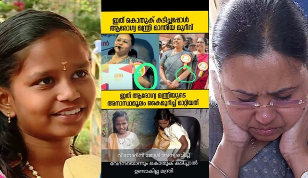 വിനോദിനിയുടെ അമ്മ പ്രസീത വാട്സ്അപ്പ് സ്റ്റാറ്റസിലൂടെയാണ് ആരോഗ്യമന്ത്രിയെ വിമർശിച്ചിരിക്കുന്നത്. മന്ത്രിയുടെ കൈയിലെ മുറിവിൻ്റെ ഫോട്ടോയും മന്ത്രിയുടെ അനാസ്ഥമൂലം കൈമുറിച്ചു മാറ്റിയ വിനോദിനിയുടെ ഫോട്ടോയും പോസ്റ്റിലുണ്ട്. സെപ്റ്റംബർ 30നാണ് കൈ ഒടിഞ്ഞതിനെ തുടർന്ന് പാലക്കാട് പല്ലശ്ശന സ്വദേശിയായ വിനോദിനി പാലക്കാട് ജില്ലാ ആശുപത്രിയിൽ ചികിത്സ തേടിയത്. എന്നാൽ, ചികിത്സാ പിഴവിനെ തുടർന്ന് കുട്ടിയുടെ വലതുകൈ മുറിച്ചു മാറ്റേണ്ടി വരികയായിരുന്നു.