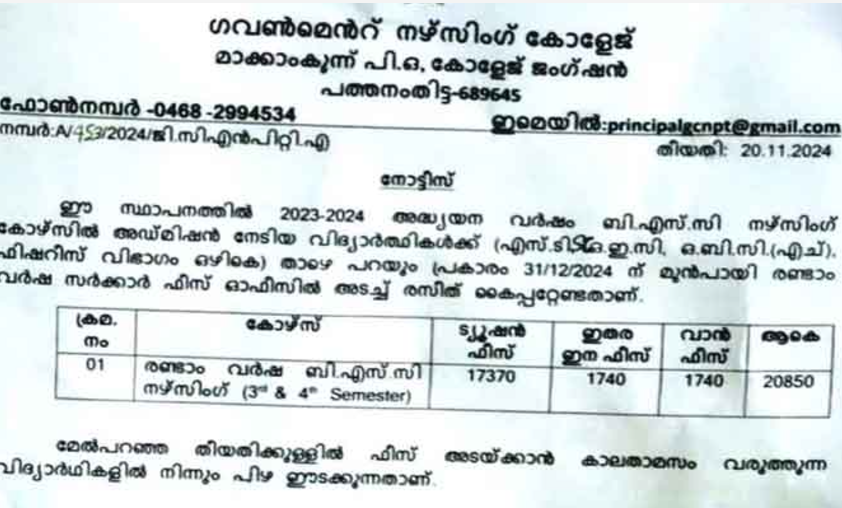 ഇല്ലാത്ത വാനിനും ഫീസ് വാങ്ങി പത്തനംതിട്ട ഗവ.നഴ്സിങ് കോളേജ്…