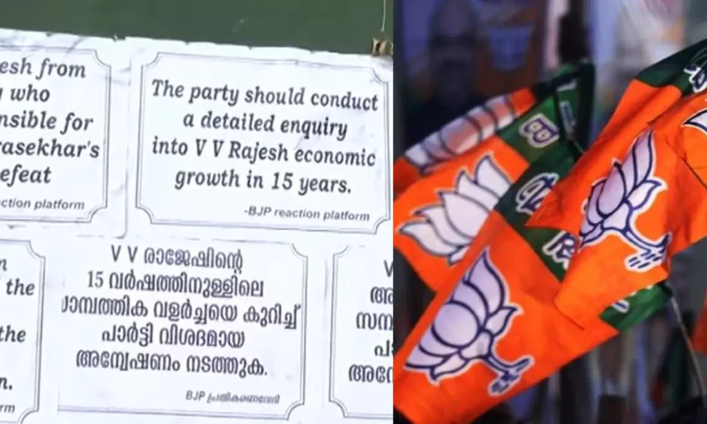 ‘ലോക്‌സഭാ തിരഞ്ഞെടുപ്പിലെ രാജീവ് ചന്ദ്രശേഖറിന്റെ തിരഞ്ഞെടുപ്പ് പരാജയത്തിന്റെ പൂര്‍ണ്ണ ഉത്തരവാദിയായ രാജേഷിനെ പാര്‍ട്ടിയില്‍ നിന്നും പുറത്താക്കണം. തിരഞ്ഞെടുപ്പില്‍ സാമ്പത്തിക തട്ടിപ്പ് നടത്തിയ രാജേഷിനെതിരെ പാര്‍ട്ടി നടപടിയെടുക്കുക. കോണ്‍ഗ്രസില്‍ നിന്നും പണം പറ്റി ബിജെപിയെ തോല്‍പ്പിച്ച വി വി രാജേഷിനെ പാര്‍ട്ടിയില്‍ നിന്നും പുറത്താക്കുക. ഇഡി റബ്ബര്‍ സ്റ്റാമ്പ് അല്ലെങ്കില്‍ രാജേഷ് അനധികൃതമായി സമ്പാദിച്ച സ്വത്ത് കണ്ടു കെട്ടുക. രാജേഷിന്റെ 15 വര്‍ഷത്തിനുള്ളിലെ സാമ്പത്തിക വളര്‍ച്ചയെക്കുറിച്ച് പാര്‍ട്ടി വിശദമായി അന്വേഷണം നടത്തണം’, എന്നീ കാര്യങ്ങളാണ് പോസ്റ്ററില്‍ ഉന്നയിച്ചിരിക്കുന്നത്.