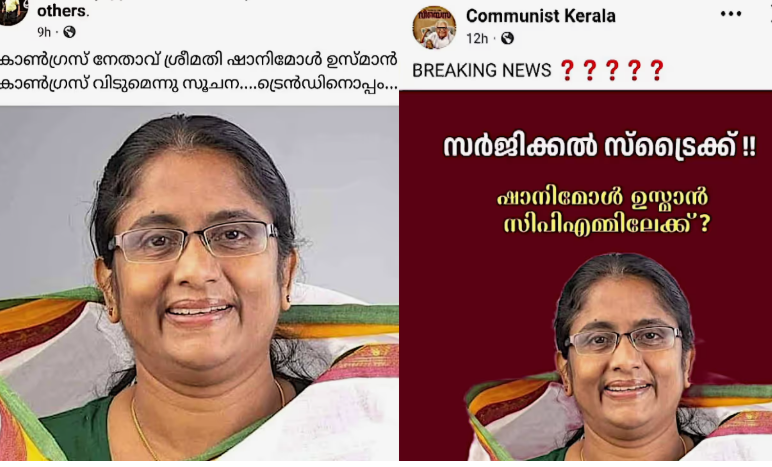 ആലപ്പുഴ: കോൺഗ്രസ് പാർട്ടി വിടുന്നതായിട്ടുള്ള സാമൂഹിക മാധ്യമ പ്രചാരണം നിഷേധിച്ച് ഷാനിമോൾ ഉസ്മാൻ. ഇടത് അനുകൂല ഫേസ്ബുക്ക് പേജുകളിലാണ് ഷാനിമോൾ ഉസ്മാൻ കോൺഗ്രസ് വിടുന്നതായി പ്രചാരണം നടക്കുന്നത്. കോൺഗ്രസ് പാർട്ടി വിട്ട് സിപിഎമ്മിൽ ചേരുന്നു എന്ന തരത്തിലുള്ള പോസ്റ്റുകളാണ് പ്രചരിക്കുന്നത്. ചില വ്യക്തികളുടെ പേരിലുള്ള പ്രൊഫൈലുകളും പോസ്റ്റ് ഷെയർ ചെയ്തിട്ടുണ്ട്. രാഹുൽ മാങ്കൂട്ടത്തിൽ വിഷയത്തെ തുടർന്ന് കോൺഗ്രസ് വിടുന്നു എന്നാണ് പോസ്റ്റുകളിൽ പറയുന്നത്.