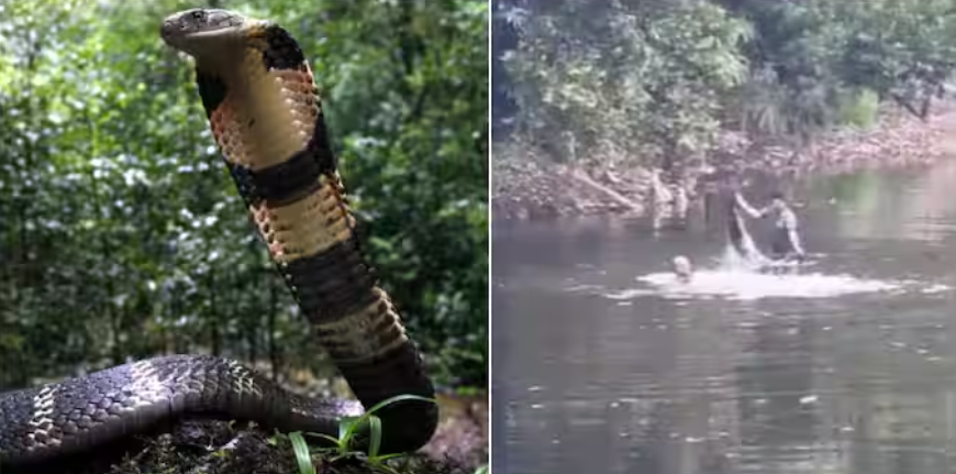 കുളിക്കടവിൽ രാജവെമ്പാല സ്ഥിരം കാഴ്ച്ച…വെള്ളത്തിലിറങ്ങി സാഹസികമായി പിടികൂടി…