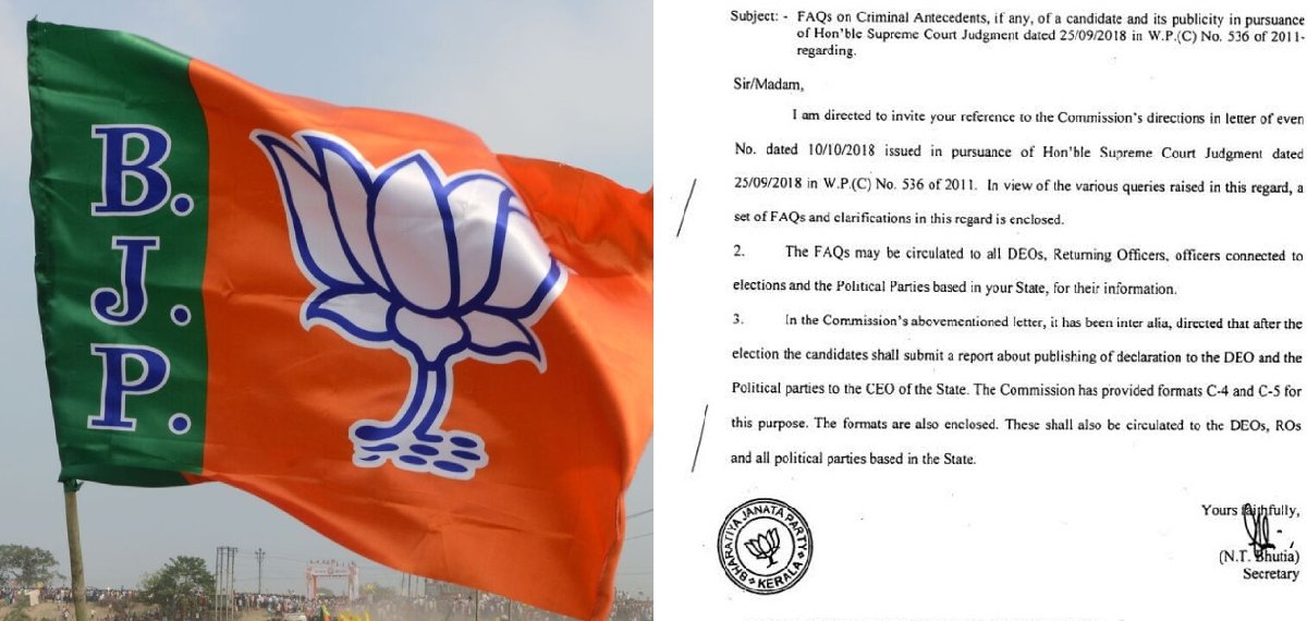 2019 തെരഞ്ഞെടുപ്പ് കമ്മീഷന് പുറത്തിറക്കിയ ചട്ടങ്ങള് വിശദീകരിച്ചുകൊണ്ടായിരുന്നു തെരഞ്ഞെടുപ്പ് കമ്മീഷന്റെ കത്ത്. സംഭവം വിവാദമായതോടെ സാങ്കേതിക പിഴവാണ് സംഭവിച്ചതെന്നും കത്തില് സീല് ഉണ്ടായിരുന്നത് ശ്രദ്ധിച്ചിരുന്നില്ലെന്നുമാണ് തെരഞ്ഞെടുപ്പ് കമ്മീഷന് നല്കിയ വിശദീകരണം. ബിജെപി സീല് പ്രത്യക്ഷപ്പെട്ടതിനെതിരെ സിപിഐഎമ്മും കോണ്ഗ്രസും രംഗത്തെത്തിയിട്ടുണ്ട്.