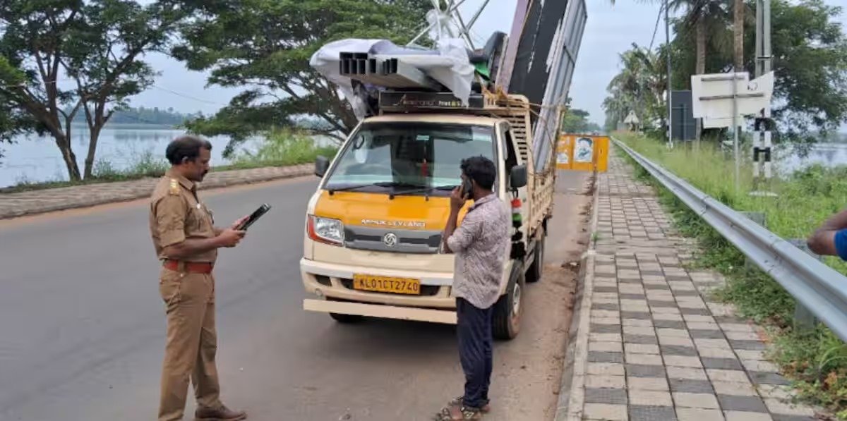 തുടർന്നുള്ള പരിശോധനയിൽ ഡ്രൈവർക്ക് ഡ്രൈവിംഗ് ലൈസൻസ് ഇല്ലാതെയാണ് ഇത്രയും ദൂരം ഓടിച്ചു വന്നതെന്നും ഈ വാഹനത്തിന് പുക പരിശോധന സർട്ടിഫിക്കറ്റും ഇൻഷ്വറൻസും ഇല്ലെന്നും കണ്ടെത്തി. കെഎൽ 01 ct 2740 എന്ന രജിസ്ട്രേഷൻ നമ്പറോടുകൂടിയ വാഹനത്തിൽ കൊച്ചി മറൈൻ ഡ്രൈവിലേക്ക് എക്സിബിഷൻ നടത്തുന്നതിനായുള്ള സാമഗ്രികൾ ആയിരുന്നു ഉണ്ടായിരുന്നത്. തിരുവനന്തപുരം സ്വദേശി ബൈജു എസ് എൽ ആണ് വാഹനത്തിന്റെ ഉടമ.
