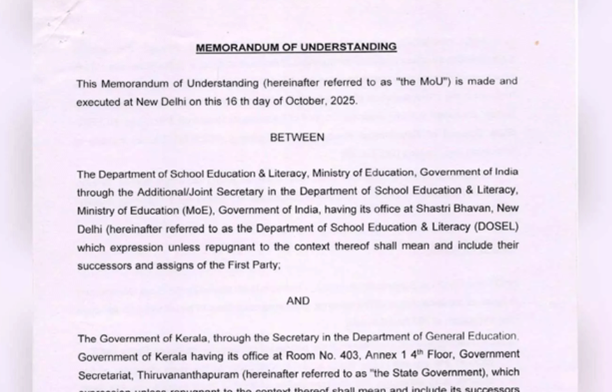 പിഎം ശ്രീ പദ്ധതിയിൽ സംസ്ഥാന സർക്കാർ ഒപ്പുവെച്ചത് ഈ മാസം 16ന്; എംഒയുവിന്റെ പകർപ്പ് പുറത്ത്