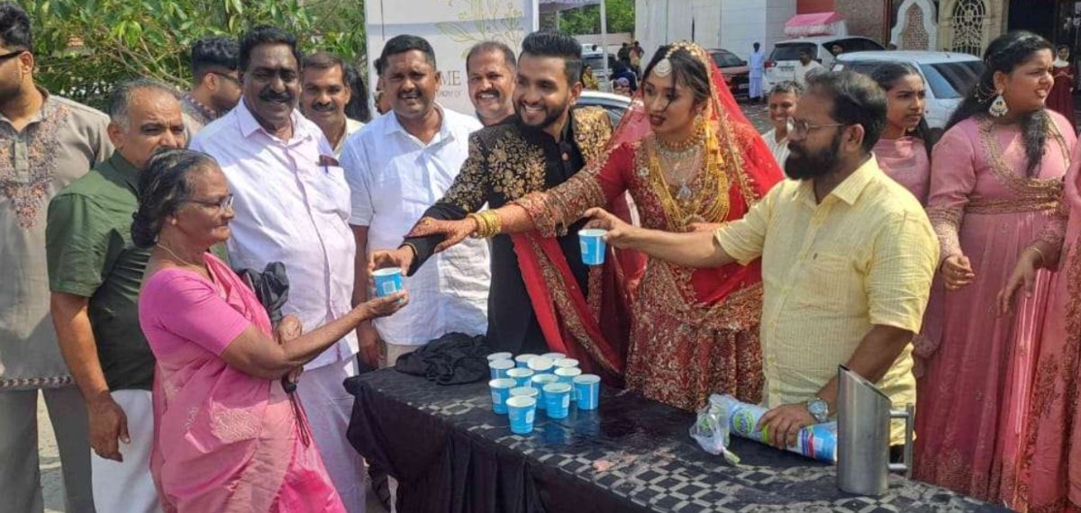 ഇന്നലെ ഉച്ചയ്ക്ക് മേവറം ബൈപ്പാസിലുള്ള സ്വകാര്യ കണ്‍വെന്‍ഷന്‍ സെന്ററില്‍ വെച്ചായിരുന്നു ഇരുവരുടെയും വിവാഹം. ശേഷം ഇവര്‍ വഴിയാത്രക്കാര്‍ക്ക് ജ്യൂസ് നല്‍കുകയായിരുന്നു. ചൂടിന്റെ കാഠിന്യത്തില്‍ നിന്നും നിരവധിപ്പേര്‍ക്കാണ് വധൂവരന്‍മാര്‍ ആശ്വാസം പകര്‍ന്നത്.