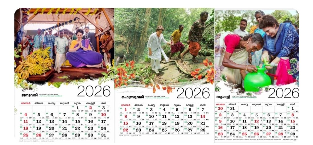 മുക്കം മണാശേരി ശ്രീ കുന്നത്ത് മഹാവിഷ്ണു ക്ഷേത്രത്തിൽ പ്രിയങ്ക ഗാന്ധി എംപി നടത്തിയ തുലാഭാരം വഴിപാടാണ് ജനുവരി മാസത്തിന്റെ മുഖചിത്രം. കരുളായിയിൽ കാട്ടാന ആക്രമണത്തിൽ കൊല്ലപ്പെട്ട മണിയുടെ സഹോദരൻ അയ്യപ്പന്റെ കൈ പിടിച്ച് നിലമ്പൂർ ചോലനായ്ക്കർ ഉന്നതിയിൽ നടക്കുന്ന ചിത്രമാണ് ഫെബ്രുവരി മാസത്തേത്. നൂൽപ്പുഴയിൽ കുടുംബശ്രീ സംരംഭമായ വനദുർഗ മുള ഉത്പന്ന കേന്ദ്രത്തിൽ സരസ്വതി കൊട്ട നെയ്യുന്നത് കൗതുകത്തോടെ നോക്കി പഠിക്കുന്ന പ്രിയങ്ക ഗാന്ധിയുടെ ചിത്രവും ചെറുവയൽ രാമനോടൊപ്പം കൃഷിയിടത്തിൽ നടക്കുന്ന ചിത്രവുമെല്ലാം ഓരോ മാസത്തിലെ കലണ്ടറിൽ ഉൾപ്പെടുത്തിയിട്ടുണ്ട്.